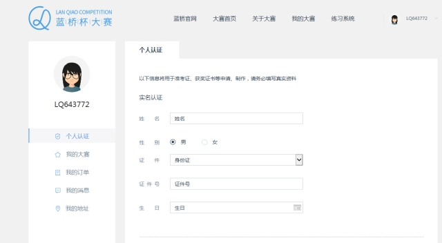 注意:每位参加校内选拔赛的同学必须进行实名认证后,才能使用练习系统考试,因个人没有认证,将不能使用蓝桥杯系统进行校内选拔,影响成绩的后果自负。若有问题请在蓝桥杯选拔赛(258957154)交流群里留言。