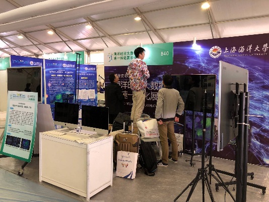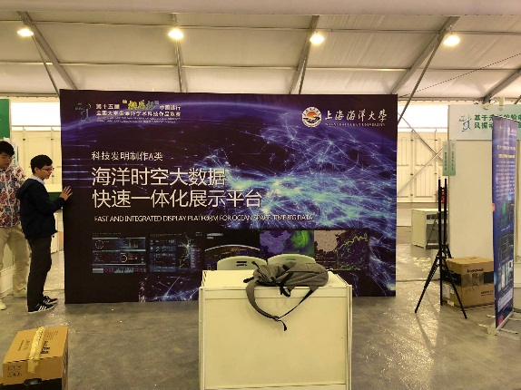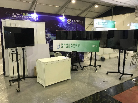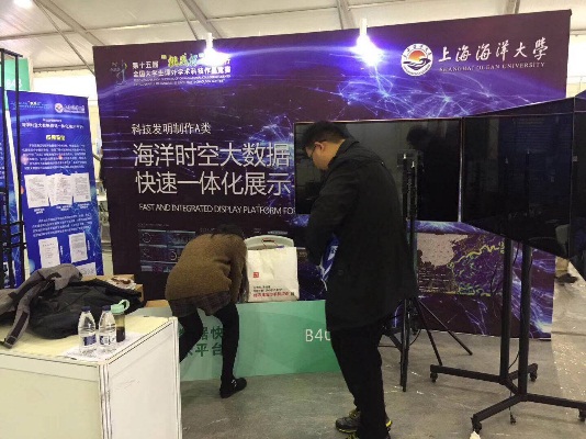 今年是“十三五“规划实施的重要一年,大赛以”服务科创中心建设和开展高水平大学建设“为重要契机,积极响应十九大号召。3044永利集团研究生团队设计研发的“海洋时空大数据快速一体化展示平台“项目强势入围国赛,并14日开始布展,在布展过程中吸取了市级竞赛的经验,综合考虑场馆搭建形式,制作了幕布、宣传册、宣传视频等多媒体宣传品,在展区最前面,放置了宣传视频及两块KT板分别展示作品简介及作品成果;在左侧制作了三面易拉宝分别展示了作品的三个创新点及应用成果;为了突出产品的展示效果,在展台右侧搭建三台55寸高清大屏,模拟实际展示内容。布展过程中,团队成员分工合作,充分利用有限的展台空间呈现出项目的多屏联动展示效果,为迎接专家评审做好充分准备。