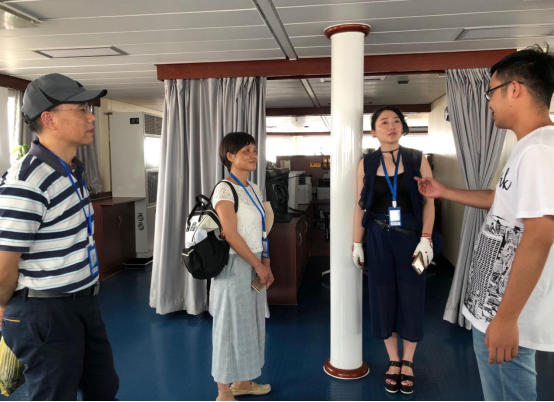 大家冒着中午的炎炎烈日,迫不及待地登上了“淞航号”,开启了探秘之旅。首先大家观看了一段视频,简单了解了“淞航号”的构造与其肩负的使命。随后,在工作人员的带领下,大家参观了一到三层的驾驶舱、通用实验室、恒温实验室和船员住舱等,并向工作人员详细询问调查船上安装的科考设备、采集数据类型及可提供的实验条件。