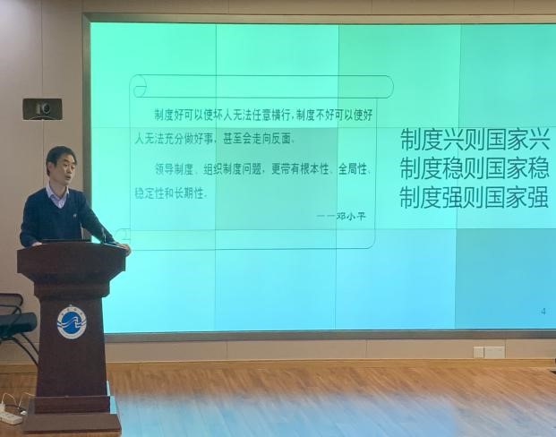 宣讲会紧密围绕对党的十九届四中全会精神的研究解读展开。段彦波围绕“全会的情况和意义”“《决议》的理论贡献”“把全会精神落实”三个方面进入深入阐释。他在开篇致辞中着重强调了身为新时代的研究生,应该加强自身道德修养,加深对党的认同。随后,他从一个“如何分餐”的问题出发,引起广大研究生对于制度的沉思,以点带面,进而引出振聋发聩的一句话:制度兴则国兴。他强调,实践证明,中国特色社会主义制度和国家治理体系是以马克思主义为指导、植根中国大地、具有深厚中华文化根基、深得人民拥护的制度和治理体系,是具有强大生命力和巨大优越性的制度和治理体系,是能够持续推动拥有近十四亿人口大国进步和发展、确保拥有五千多年文明史的中华民族实现“两个一百年”奋斗目标进而实现伟大复兴的制度和治理体系。