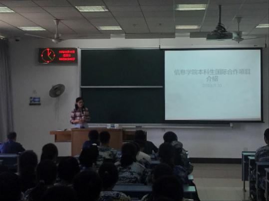 然后,袁红春副经理及王文娟老师则带给大家的是公司出国学习方面的资讯,这其中包括短期的暑期游学项目、2+2,3+1的双学位项目,以及为期一学期的国外学习项目,通过整个国际交流项目的介绍,为员工国际交流学习提供了极大的便利。