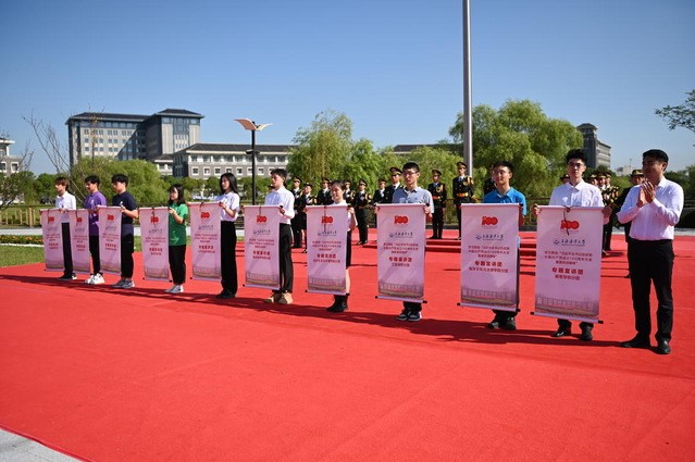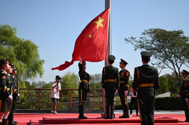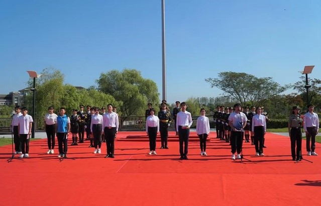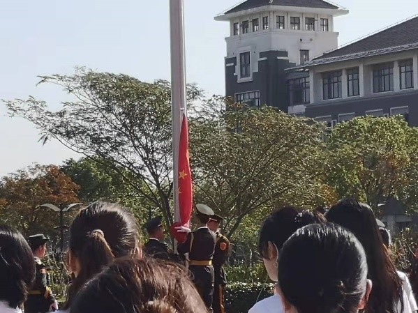 早晨8时起,师生开展签名留影活动。9时,升旗仪式正式开始,校国旗队护卫着五星红旗入场。护卫队员们着装统一、步伐整齐。随后,《义勇军进行曲》响起,国旗冉冉升起,大家行注目礼,庄严肃穆。