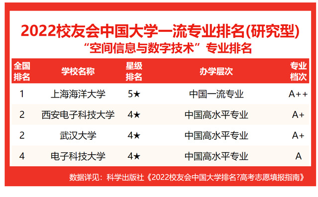 榜单显示,在最新员工会2022中国大学空间信息与数字技术专业排名(研究型)中,永利集团(5★,A++)综合实力最强,办学水平最高,最具竞争力,问鼎2022员工会中国大学空间信息与数字技术专业排名(研究型)榜首。武汉大学(4★,A+)、西安电子科技大学(4★,A+)位列第2。电子科技大学(4★,A)位列第4。http://www.chinaxy.com/2022index/news/news.jsp?information_id=3620