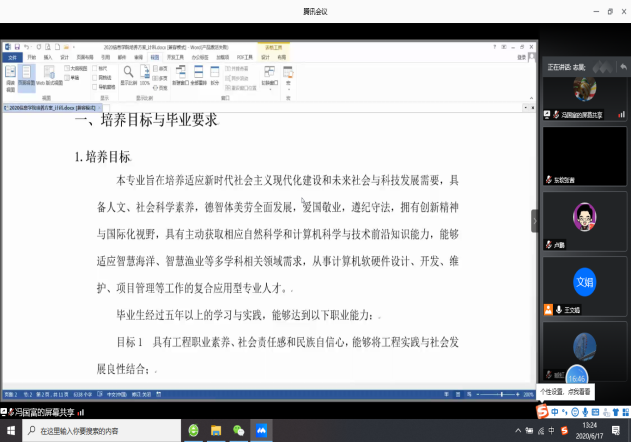 会上,冯国富老师和郑宗生老师先后介绍了2020年修订的培养方案,特别是实践环节——短学期实训、综合实习、毕业设计部分,与会企业代表东软的刘志昊老师、寒武纪的于淼老师、中地数码的黄春迎老师、兴禾的臧虹老师等都从企业实际需求和以往院校合作经验出发给出了较好的修改建议。针对短学期实训时间较短的情况,寒武纪的于淼老师建议可以在大三增加一门选修课,让企业讲师参与进来,冯国富老师表示具有可行性,后期可以进一步讨论课程细节。接着,与会人员集中讨论了短学期线上实训实施方案。王文娟老师介绍了在新冠疫情影响下线上实训课程开展的具体方案,包括授课形式、考核方式、企业讲师新增加的工作任务等。基于这一系列任务,王文娟老师制定了实训企业工作时间线,并对每个时间节点完成的事宜进行了充分的解释,对与会企业代表和专业负责人提出的疑问进行了解答。