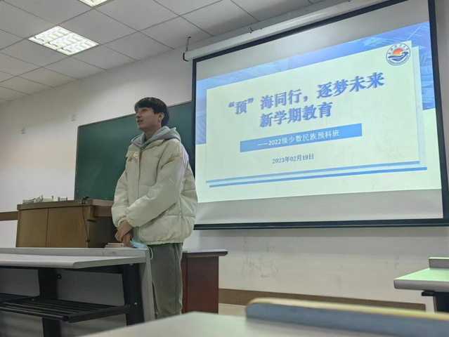 为促进少数民族预科新生尽快适应新学期生活,增强员工自律意识,规范员工日常行为和营造良好的学习环境,少数民族预科生管理中心于2023年2月19日在公共实验楼B301教室开展了““预”海同行,逐梦未来”新学期教育。本次班会由辅导员赛买提江老师主持,2022级预科班全体参加。
