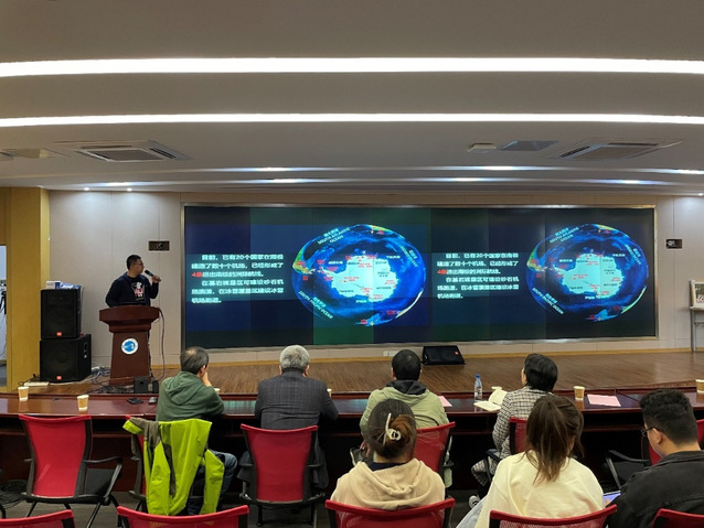 中国极地研究中心研究员唐学远老师,“极地冰盖多圈层相互作用与气候变化”团队负责人。报告题目: 南极冰盖内部结构与不稳定性,唐老师为全体师生讲述南极冰盖内部结构和不稳定形成原因等理论技术,为同学们展示了南极冰盖最新研究成果。