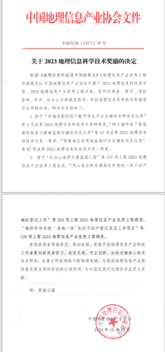 中国地理信息产业协会,简称中国GIS协会(CAGIS),该协会是中国从事地理信息产业的、非盈利性、全国产业性的社会组织,由单位会员和个人会员自愿组成,具有法人资格的国家一级协会。“地理信息科技进步奖”是我国地理信息行业的最高科技成果奖项之一,由国家科学技术部、国家科学技术奖励工作办公室、自然资源部批准设立,主要授予在中国地理信息科学研究、技术创新开发、科技成果推广应用、高新技术产业化、重大工程建设等方面,做出突出贡献的公民、组织。