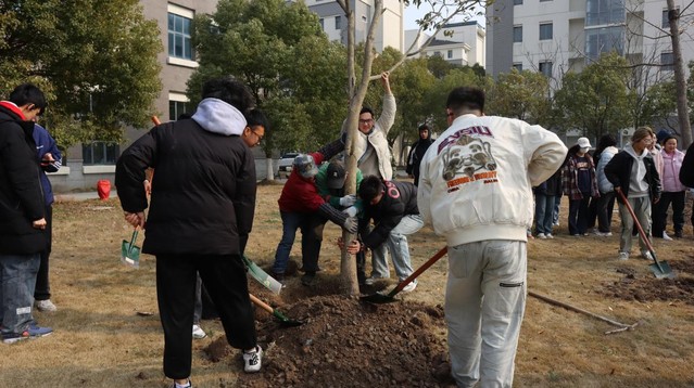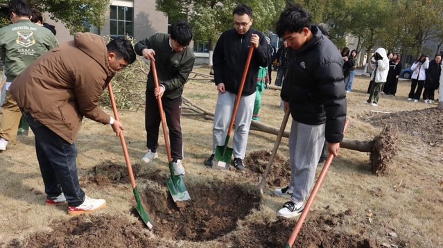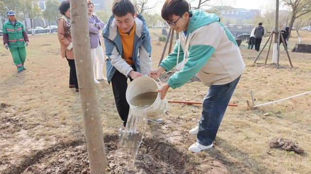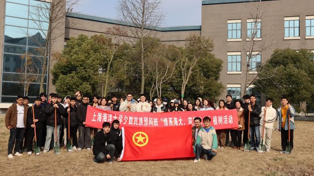 在线下,少数民族预科生的同学们在老员工活动中心西侧树林进行植树活动。在园丁叔叔的耐心指导下,师生手持铁锹、刨土挖坑、摆正树苗、培土浇水,分工明确,互帮互助,沉浸在植树活动的乐趣中,用心种下承载希望的树苗,共同种下团结之树。